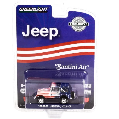 Brand new 1/64 scale diecast car model of 1982 Jeep CJ-7 “Santini Air” with American Flag Graphics “Hobby Exclusive” die cast model car by Greenlight.Limited edition.Brand new box.Real rubber tires.True-to-scale detail.Authentic decoration.Detailed interior, exterior.Comes in a blister pack.Officially licensed product.Die-cast metal body and chassis.Manufacturer’s original unopened packaging.Dimensions approximately L-2.5 inches long.