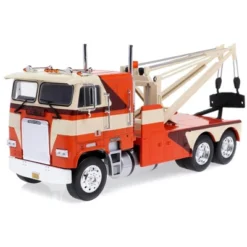 Brand new 1/43 scale diecast car model of 1984 Freightliner FLA 9664 Tow Truck Orange and White with Brown Graphics die cast model car by Greenlight.Limited edition.Brand new box.Chrome accents.Real rubber tires.True-to-scale detail.Detailed interior, exterior.Officially licensed product.Does not have any openings.Comes in plastic display showcase.Manufacturer’s original unopened packaging.Made of diecast metal with some plastic parts.Dimensions approximately L-7.25, W-2, H-3.25 inches.