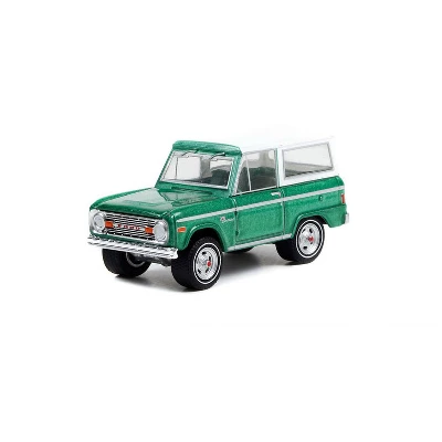 Produced by Greenlight Collectibles, this is a 1/64 scale 1977 Ford Bronco Jade Glow, Lot 1001.1, and it is part of the Barrett Jackson Scottsdale Series 9. This Bronco measures approximately 2.75″L x 1″W x 1.25″H, and it is made of plastic, rubber, and diecast. Per the manufacturer, this item is recommended for ages 8+ years, for display only.