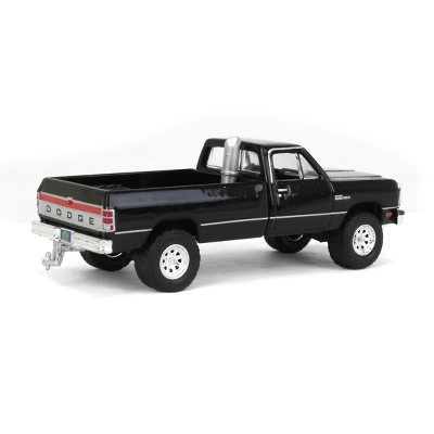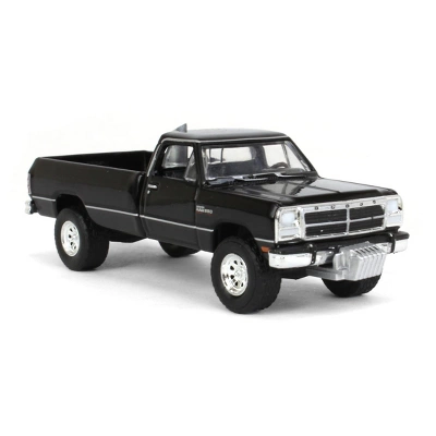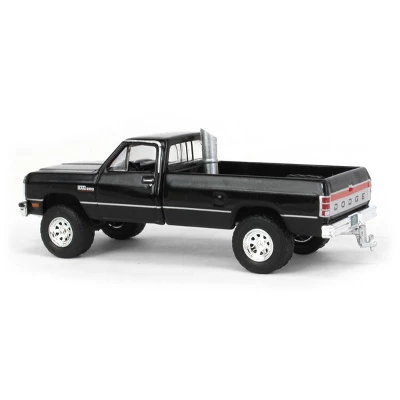 Produced by Greenlight Collectibles, this is a 1/64 scale 1992 Dodge Ram 1st Generation black pulling truck, and it is an Outback Toys Exclusive.The truck features regular pickup bed, measure approximately 3.5″L x 1.25″W x 1.25″H and made of a diecast body with some rubber and plastic parts. The truck is recommended for ages 8+.